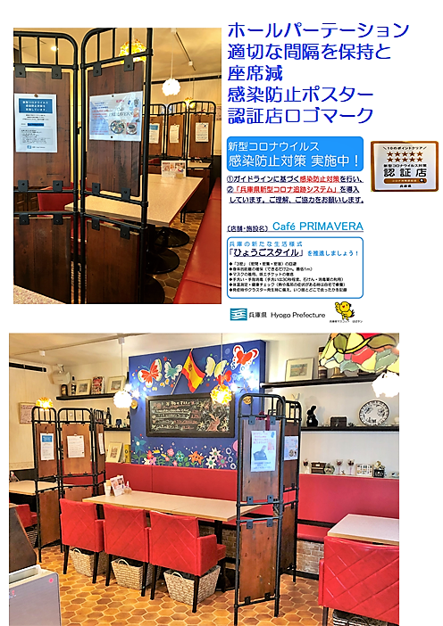 cafe PRIMAVERは兵庫県の新型コロナウィルス感染対策の認証店です。
