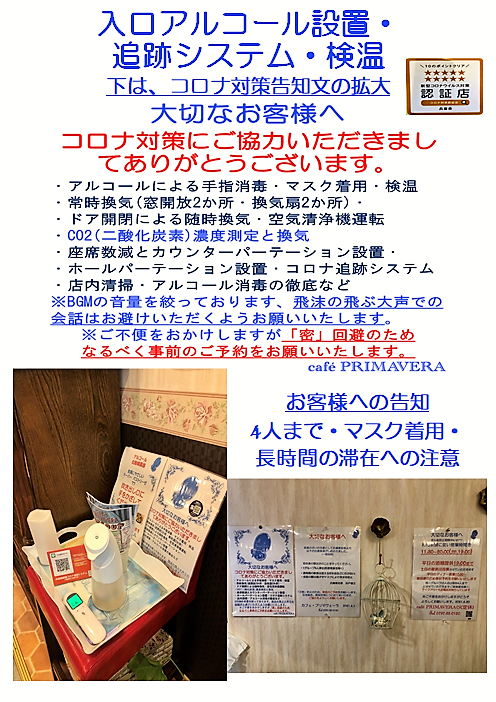 cafe PRIMAVERは引き続き、できる限りの感染対策をしてまいります。